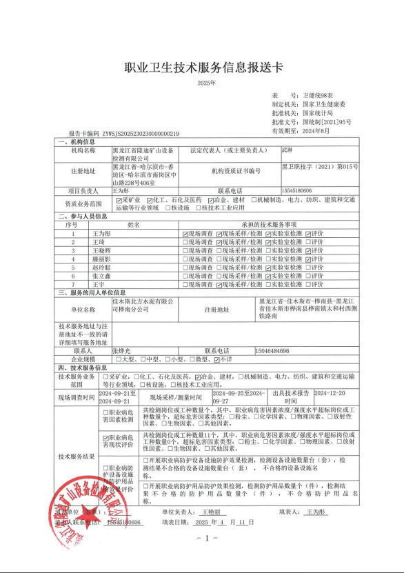 佳木斯北方水泥有限公司樺南分公司3#線職業(yè)病危害現(xiàn)狀評(píng)價(jià)